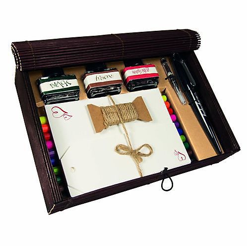 Deze Master Set voor kalligrafie komt inclusief één zwarte Online Air Calligraphy van 1,4 mm, één converter, één inktfles van 15 ml in zwart, bruin en rood. Verder komt de set met 10 Calli Brush Double Tip pennen en één Greetings Set in een duurzame, natuurlijke houten box van bamboe. Het kistje biedt veel plaats voor toepassingen van creatief schrijven en ontwerpen. Een schatkistje voor iedereen die houdt van schrijven, schilderen en design. Ook ideaal als cadeau. De adviesverkoopprijs is 52,99 euro.